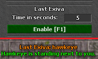 local panelName = "tcLastExiva" local tcLastExiva = setupUI([[ ExivaLabel < Label height: 12 background-color: #00000055 opacity: 0.89 anchors.horizontalCenter: parent.horizontalCenter text-auto-resize: true font: verdana-11px-rounded Panel id: msgPanel height: 26 width: 100 anchors.bottom: parent.bottom anchors.horizontalCenter: parent.horizontalCenter margin-bottom: 20 ExivaLabel id: lblMessage color: green anchors.bottom: parent.bottom !text: 'None.' ExivaLabel id: lblExiva color: orange anchors.bottom: prev.top !text: 'Last Exiva: None' ]], modules.game_interface.getMapPanel()) local tclastExivaUI = setupUI([[ Panel margin: 3 height: 66 layout: type: verticalBox HorizontalSeparator id: separator Label id: title text: Last Exiva margin-top: 1 text-align: center font: verdana-11px-rounded Panel id: time height: 22 Label !text: 'Time in seconds:' anchors.left: parent.left anchors.verticalCenter: parent.verticalCenter anchors.right: next.left text-align: center height: 15 margin-right: 6 font: verdana-11px-rounded BotTextEdit id: text text: 5 anchors.right: parent.right anchors.verticalCenter: parent.verticalCenter margin-left: 5 height: 17 width: 55 font: verdana-11px-rounded ]], parent) if not storage[panelName] then storage[panelName] = { name = '', timer = 5, } end tclastExivaUI.time.text:setText(storage[panelName].timer) tclastExivaUI.time.text.onTextChange = function(widget, text) storage[panelName].timer = tonumber(text) end local lastExiva = '' lastExiva = storage[panelName].name tcLastExiva.lblExiva:setText('Last Exiva: ' .. lastExiva) onTalk(function(name, level, mode, text, channelId, pos) if name ~= player:getName() then return end text = text:lower() -- uncomment the warn below to find the channel mode if this doesn't work -- cast exiva and you should see NUMBER : exiva "name" -- warn(mode.. ':'..text) if (mode == 34 or mode == 44) and text:find('exiva ') then lastExiva = string.match(text, [[exiva "([^"]+)]]) if lastExiva then storage[panelName].name = lastExiva tcLastExiva.lblExiva:setText('Last Exiva: ' .. lastExiva) end end end) onTextMessage(function(mode, text) if mode ~= 20 then return end local regex = "([a-z A-Z]*) is ([a-z -A-Z]*)(?:to the|standing|below|above) ([a-z -A-Z]*)." local data = regexMatch(text, regex)[1] if data and data[2] and data[3] then schedule(10, function() tcLastExiva.lblMessage:setText(text) end) end end) tclastExivaMacro = macro(100, "Enable", "F1", function() if lastExiva:len() > 0 then say('exiva "' .. lastExiva) end delay(tonumber(storage[panelName].timer) * 1000) end, tclastExivaUI) UI.Separator(tclastExivaUI)