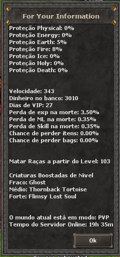 Ao usar o comando será possível ter acesso a algumas informações como: Sua proteção contra elementos, Velocidade do personagem, Dinheiro no banco, Dias de vip, Criatura Bustada, etc.