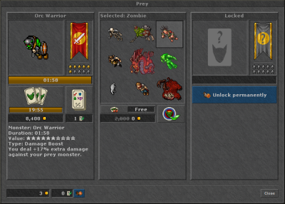 • O bônus para sua prey são selecionados aleatoriamente e podem ser: aumento de dano (damage boost), redução de danos (damage reduction), bônus de experiência (bonus XP) ou loot melhorado (improved loot).